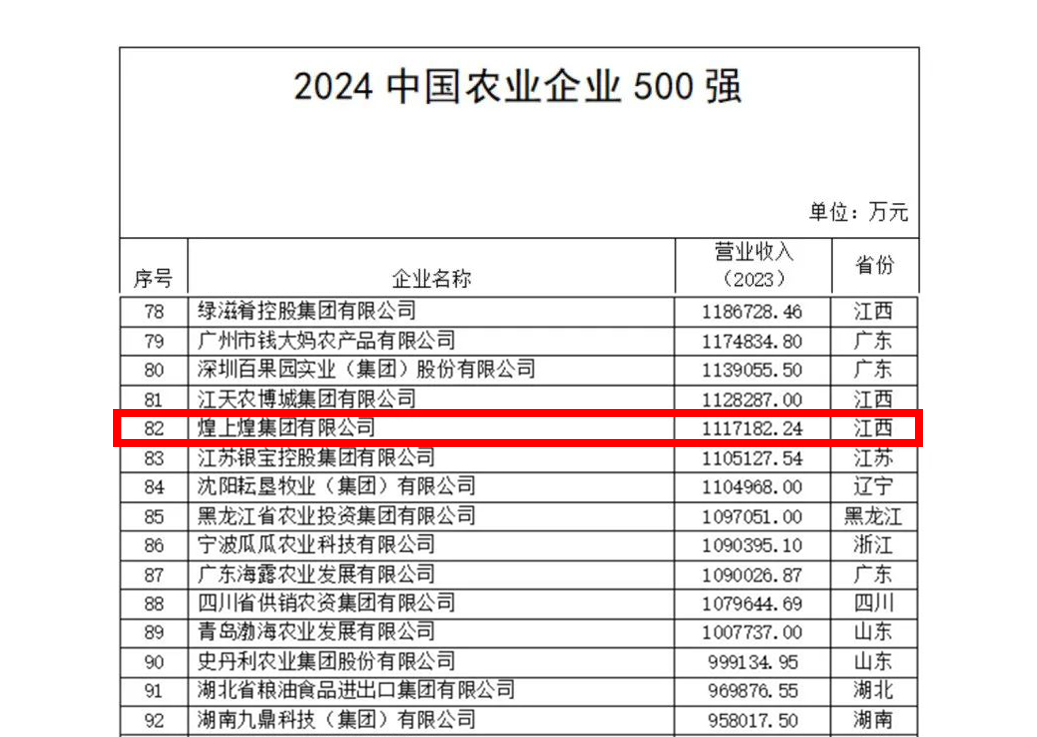 12月11日,農(nóng)民日報社發(fā)布2024中國農(nóng)業(yè)企業(yè)500強榜單。榜單聚集發(fā)布糧油、畜牧、奶業(yè)、水產(chǎn)、食品、流通、農(nóng)資等領(lǐng)域頭部企業(yè),煌上煌集團...