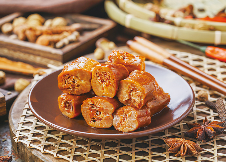 產品介紹:精選規(guī)格一致的新鮮鴨脖,摘凈淋巴組織,采用多種調味料腌漬,經真空滾揉后風味物質滲透至椎骨之中。采用20多種中藥、香料濃湯鹵汁。產品外呈醬紅,脖肉成束脆嫩,脖骨包含湯汁細啃味長。近年來,鹵鴨脖悄然成為休閑熱點醬禽鹵肉制品。